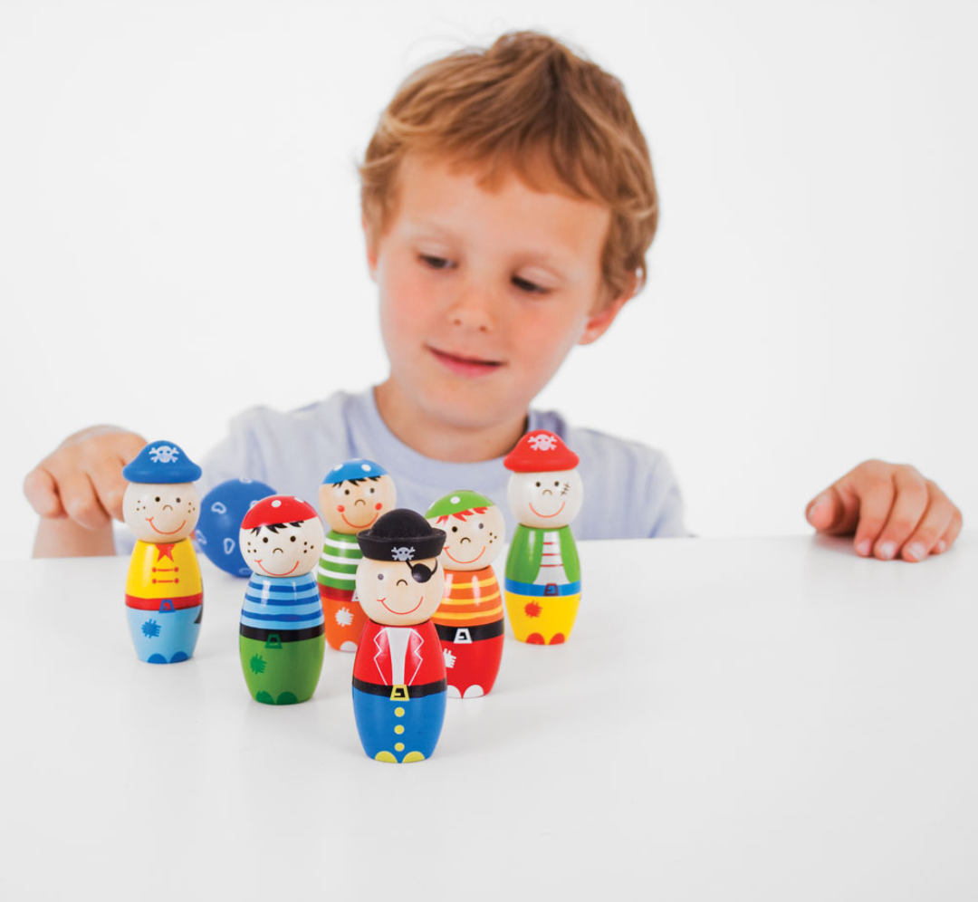 Cada bolo representa a un alegre pirata con diferentes atuendos y detalles pintados a mano, listos para ser derribados con la bola azul incluida.