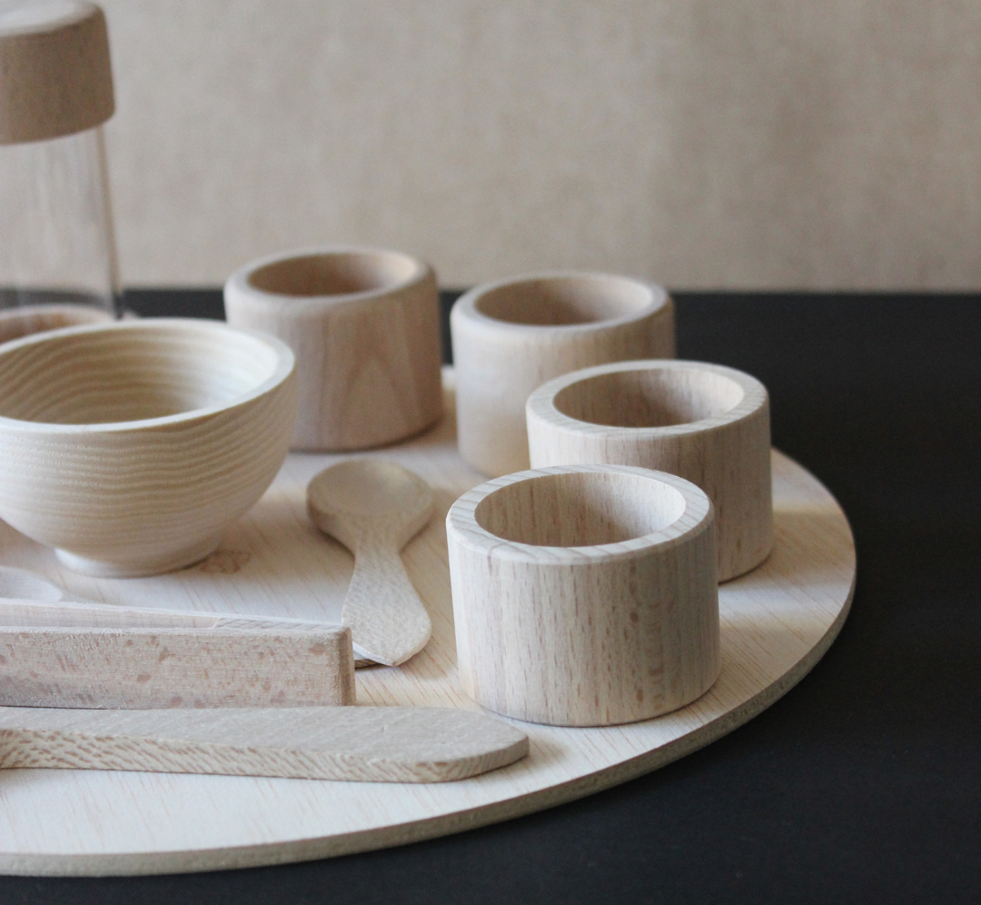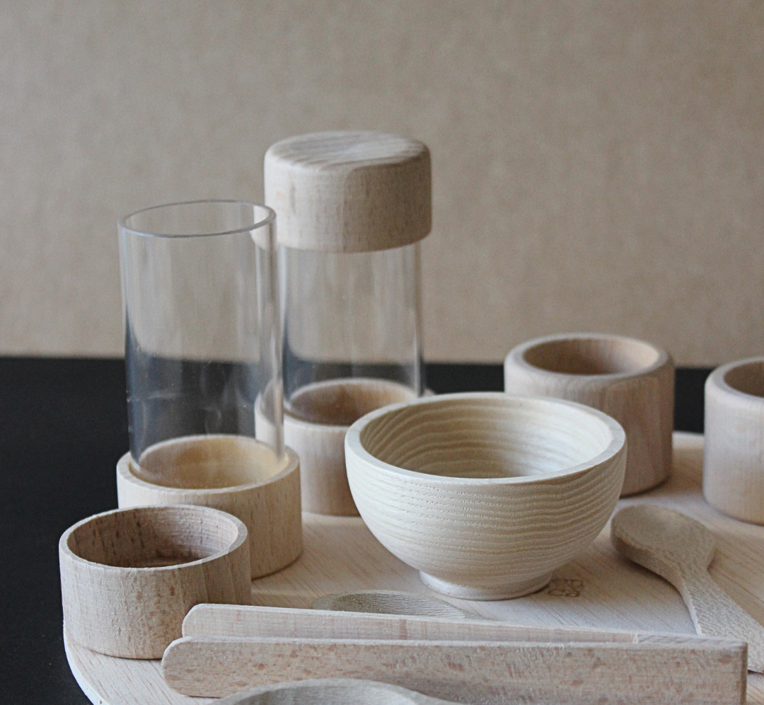 Incluye: 1 pinza, 2 tapones, 1 cuchara, 2 cucharitas, 1 bol pequeño, 2 cuencos pequeños, 1 base redonda y plana de pino natural, 2 botes transparentes acrílicos y de madera.