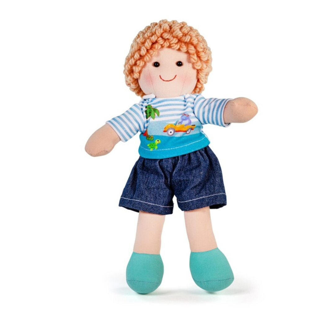 Tiene un cabello rizado de hilo en tono anaranjado, un rostro dulce con expresión amigable y un cuerpo blandito perfecto para manos pequeñas. Viste una camiseta de rayas con un divertido estampado infantil, pantalones cortos y zapatitos turquesa a juego.