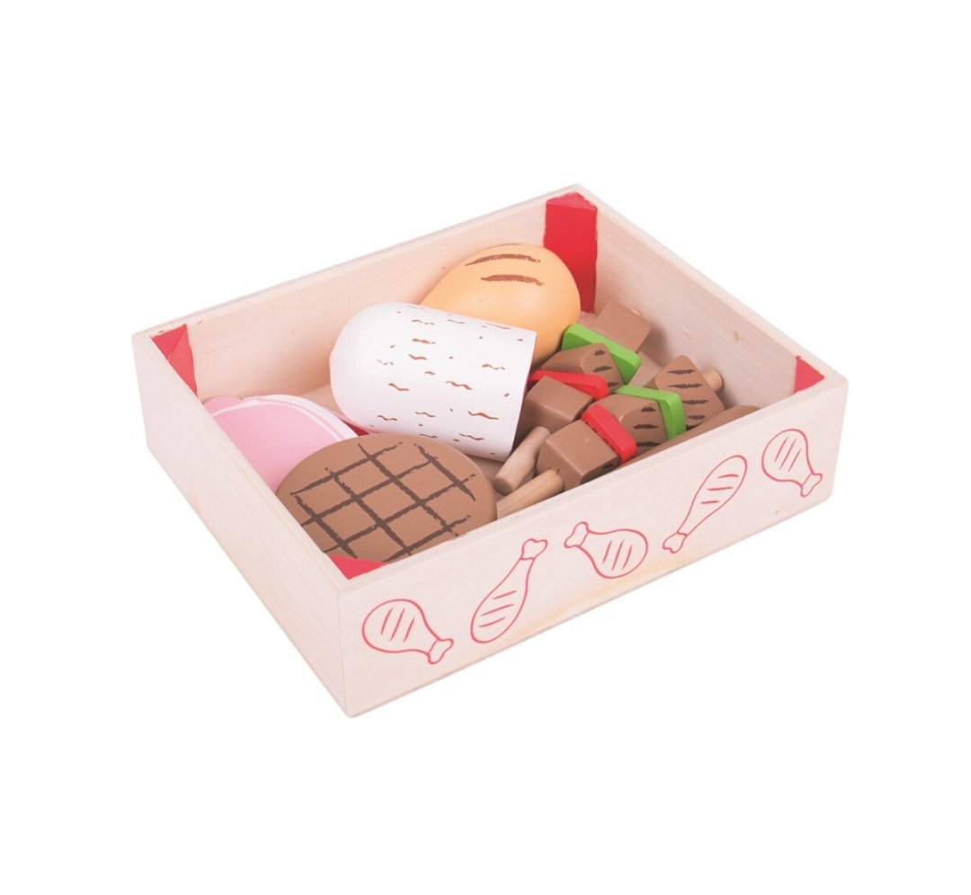 Incluye piezas coloridas y detalladas que representan distintos alimentos a la parrilla, como brochetas, hamburguesas, embutidos y otros ingredientes, todo presentado en una resistente bandeja de madera decorada con divertidos dibujos.