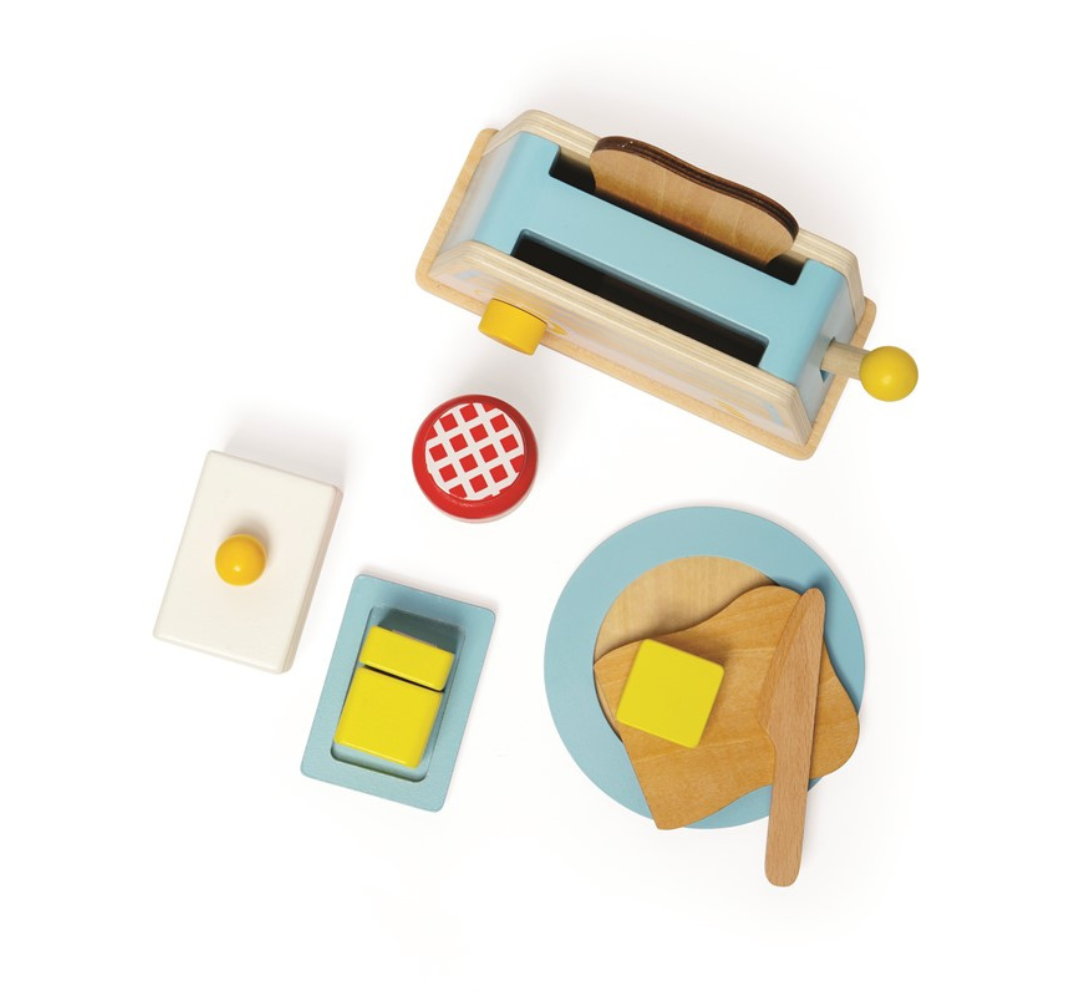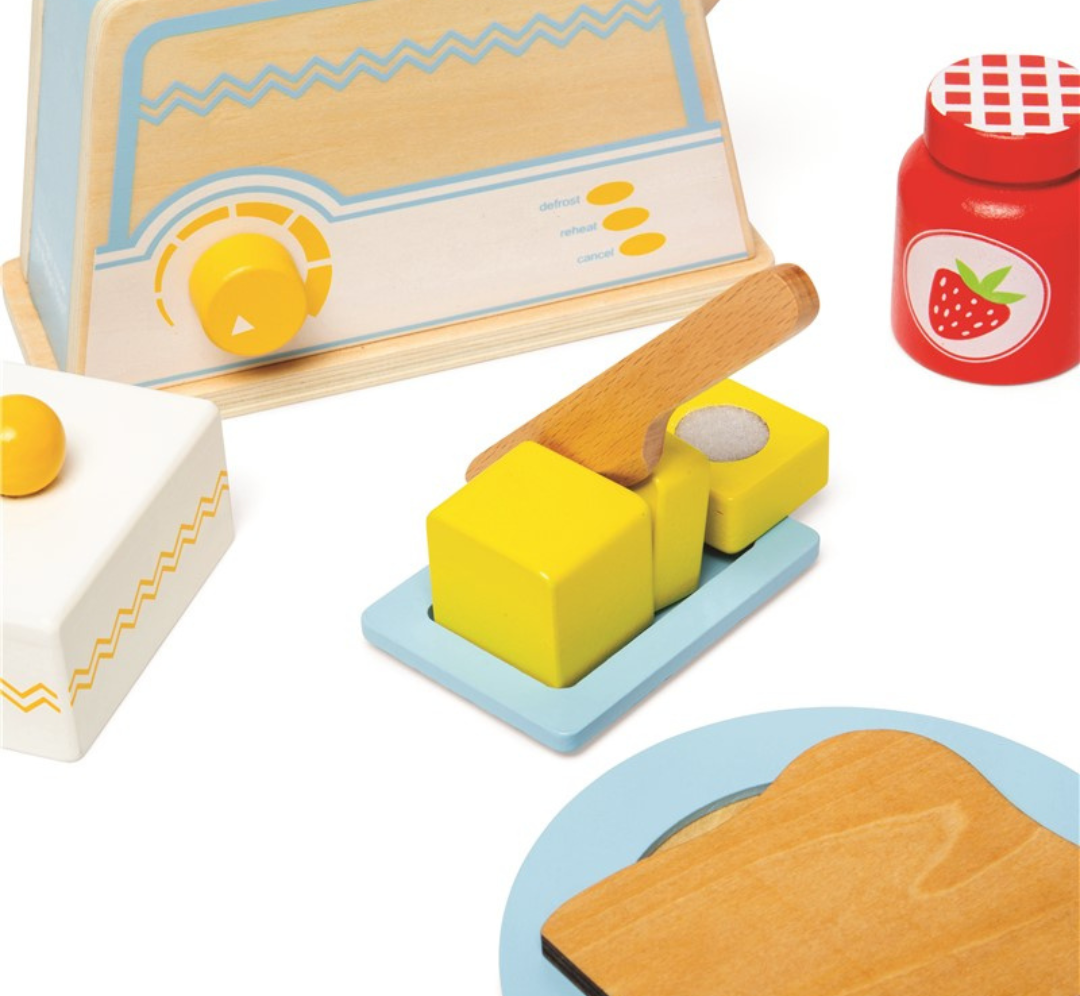 Fabricado en madera resistente y con colores suaves, es un juguete perfecto para cocinitas y juegos de rol. Al imitar acciones reales como tostar pan, untar mantequilla o preparar la mesa, los niños y niñas potencian el juego simbólico, el lenguaje y la autonomía de manera divertida y segura.