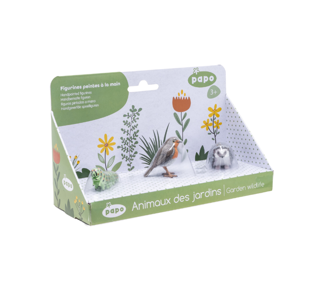 Descubre la magia de la naturaleza con este set de 3 figuras realistas que incluye una oruga, un petirrojo y un erizo.